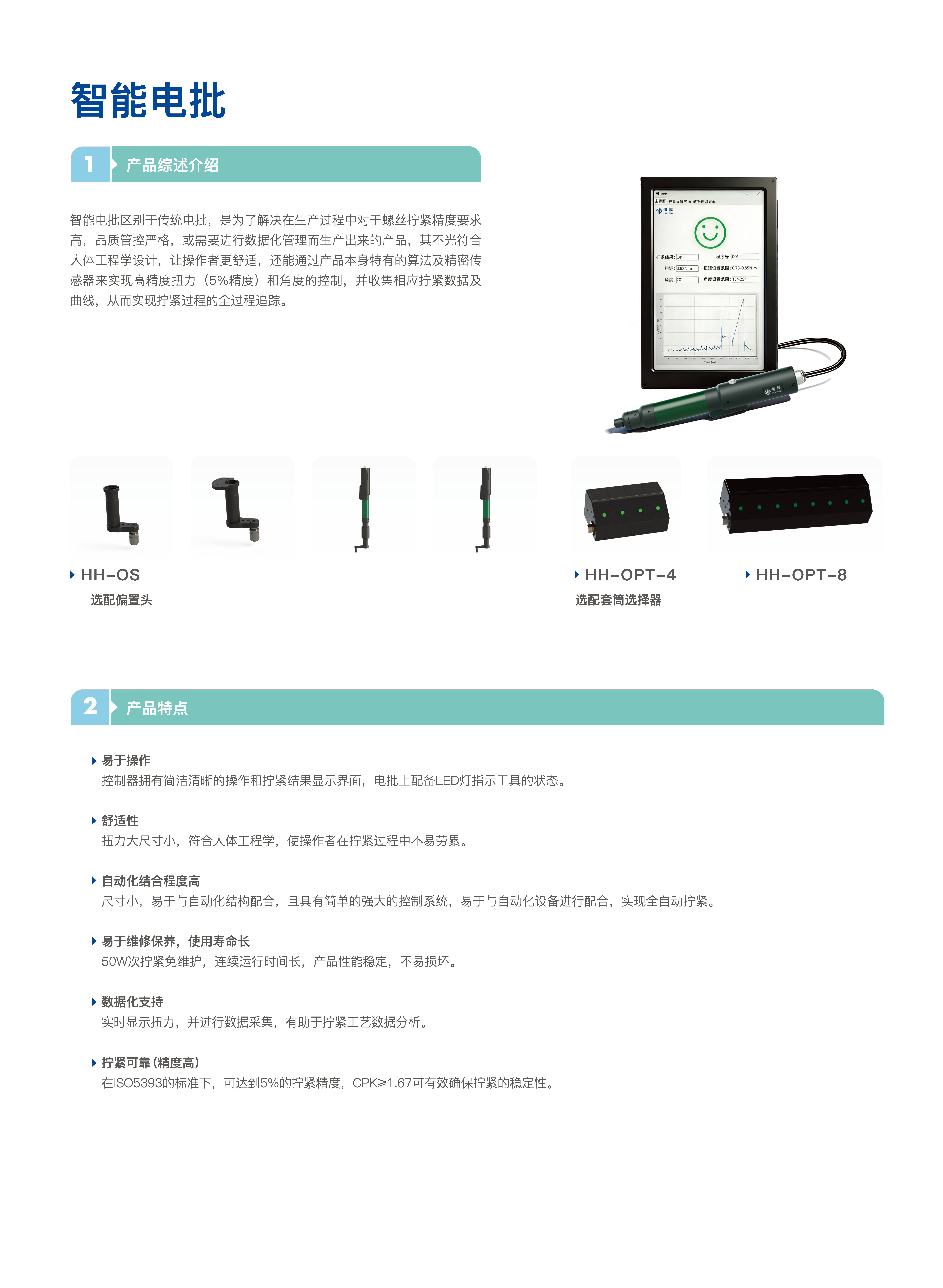 智能電批區别於傳統電批,是爲瞭解決在生産過程中對於螺絲擰緊精度要求高,品質管控嚴格,或需要進行數據化管理而生産出來的産品,其不光符合人體工程學設計,讓操作者更舒适,還能通過産品本身特有的算法及精密傳感器來實現高精度扭力(5%精度)和角度的控制,並收集相應擰緊數據及曲線,從而實現擰緊過程的全過程追蹤。